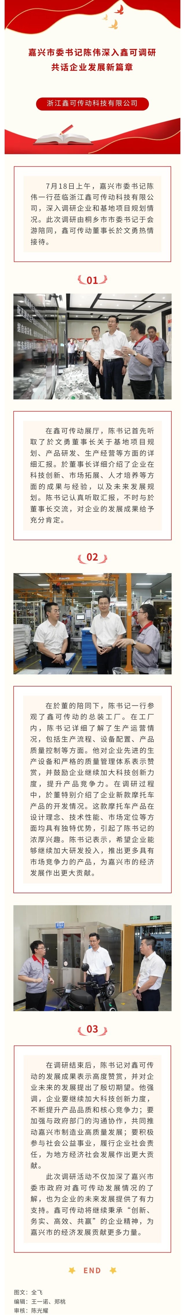 嘉興市委書記陳偉深入鑫可調(diào)研,共話企業(yè)發(fā)展新篇章 2024-07-26 08:53:36 浙江鑫可傳動科技有限公司 瀏覽次數(shù) 1064 上一條精益改善降成本 品質(zhì)經(jīng)營保交付|鑫可傳動2024年中期經(jīng)營工作大會順利召開 下一條擔(dān)當(dāng)重任|引領(lǐng)制造業(yè)高質(zhì)量發(fā)展新未來暨董事長於文勇“兩新”工作推進(jìn)大會發(fā)言