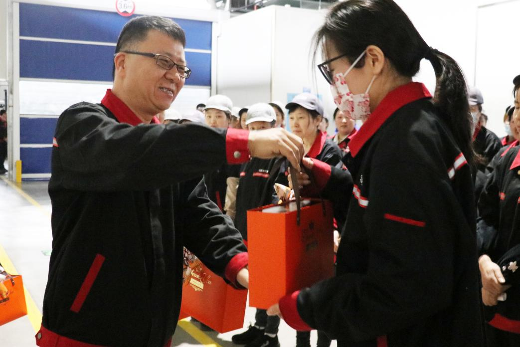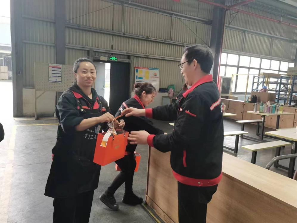 在總裝車間,浙江鑫可傳動科技有限公司常務副總經理馬強、總裝車間車間主任薛富斌為辛勤工作在各崗位的每一位女職工傳遞公司節日問候,送上溫馨的節日祝福及節日禮品。